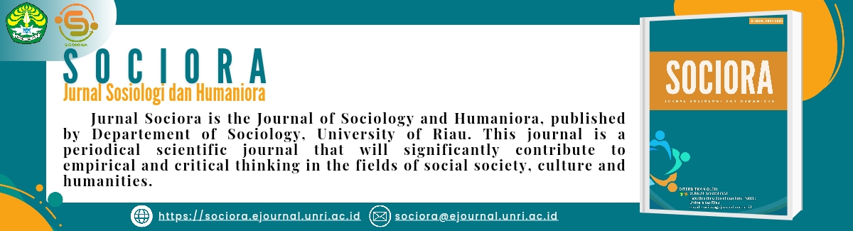 Jurnal Sociora is the Journal of Sociology and Humanities, published by Department of Sociology, Riau University. This journal is a periodical scientific journal, with a publication frequency of three times a year (March, July and November). The Sociora Journal will make a significant contribution to empirical and critical thinking in the fields of social society, culture and humanities.